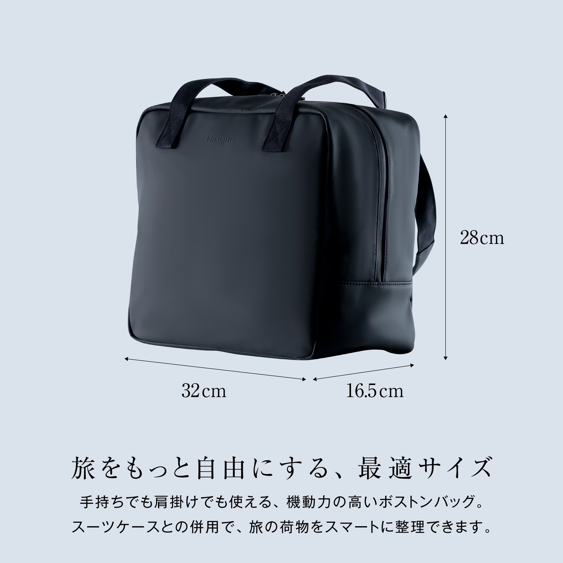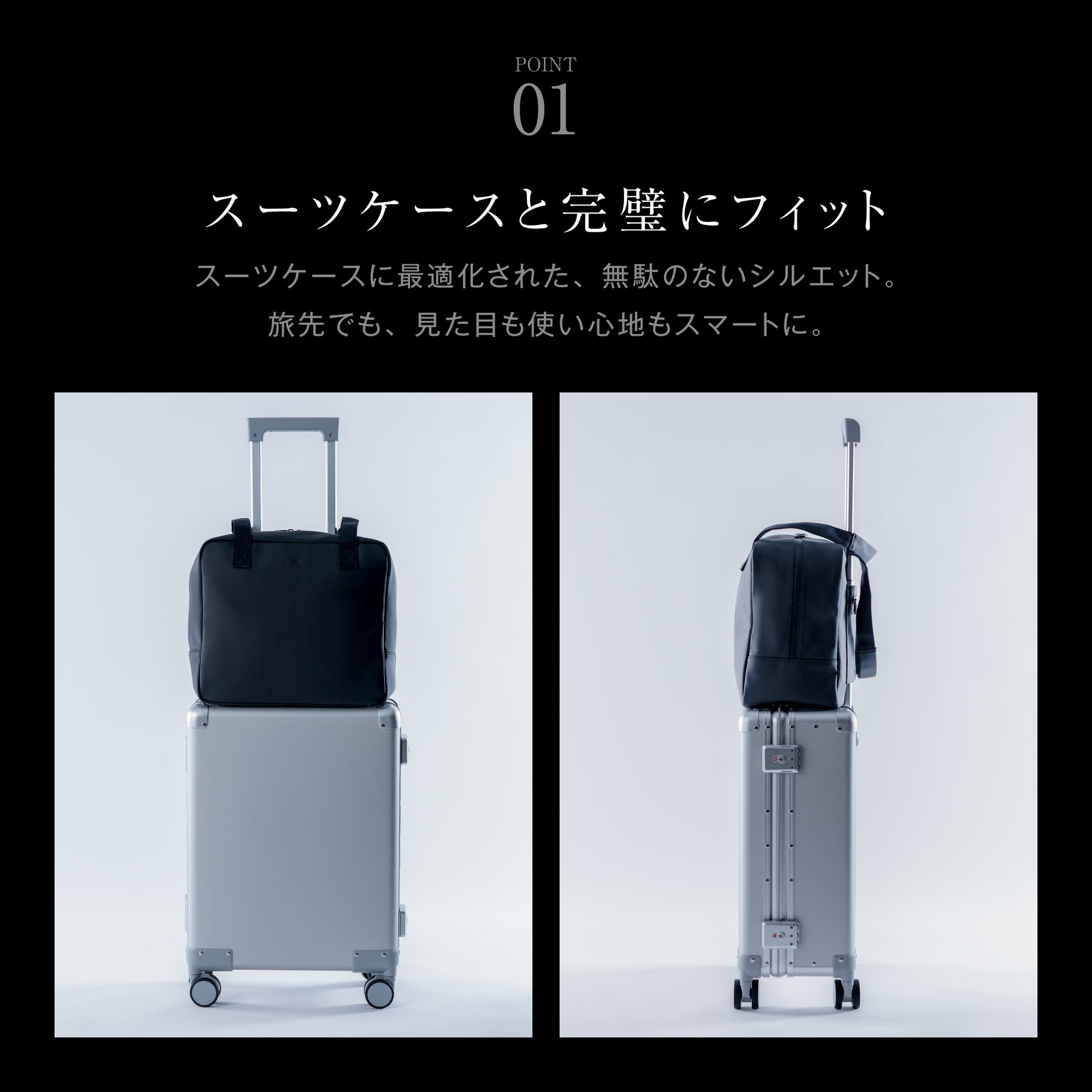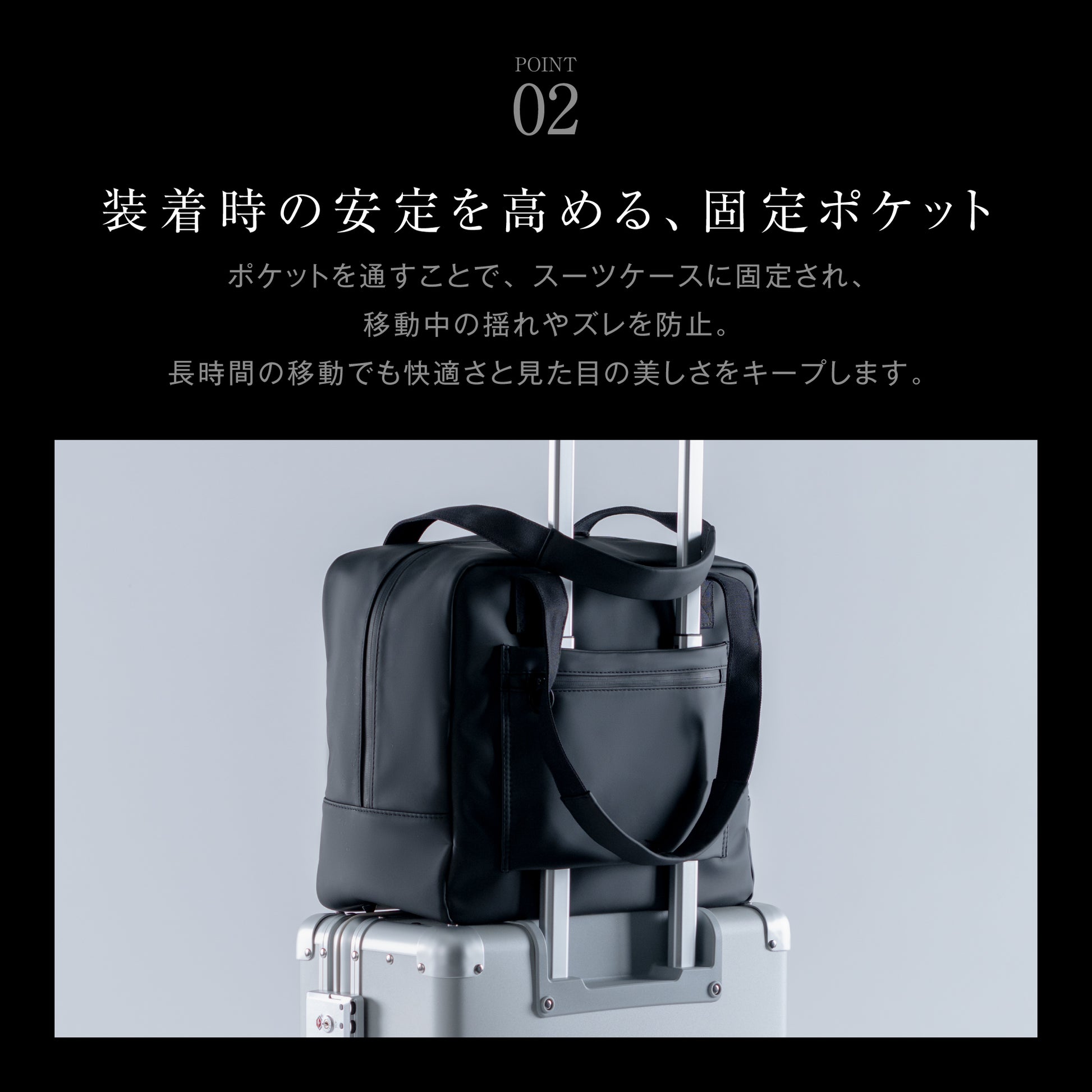 スーツケースにぴったり装着できるよう設計された専⽤ボストンバッグは、移動中のずれや落下を防⽌し、ストレスなく持ち運びが可能。