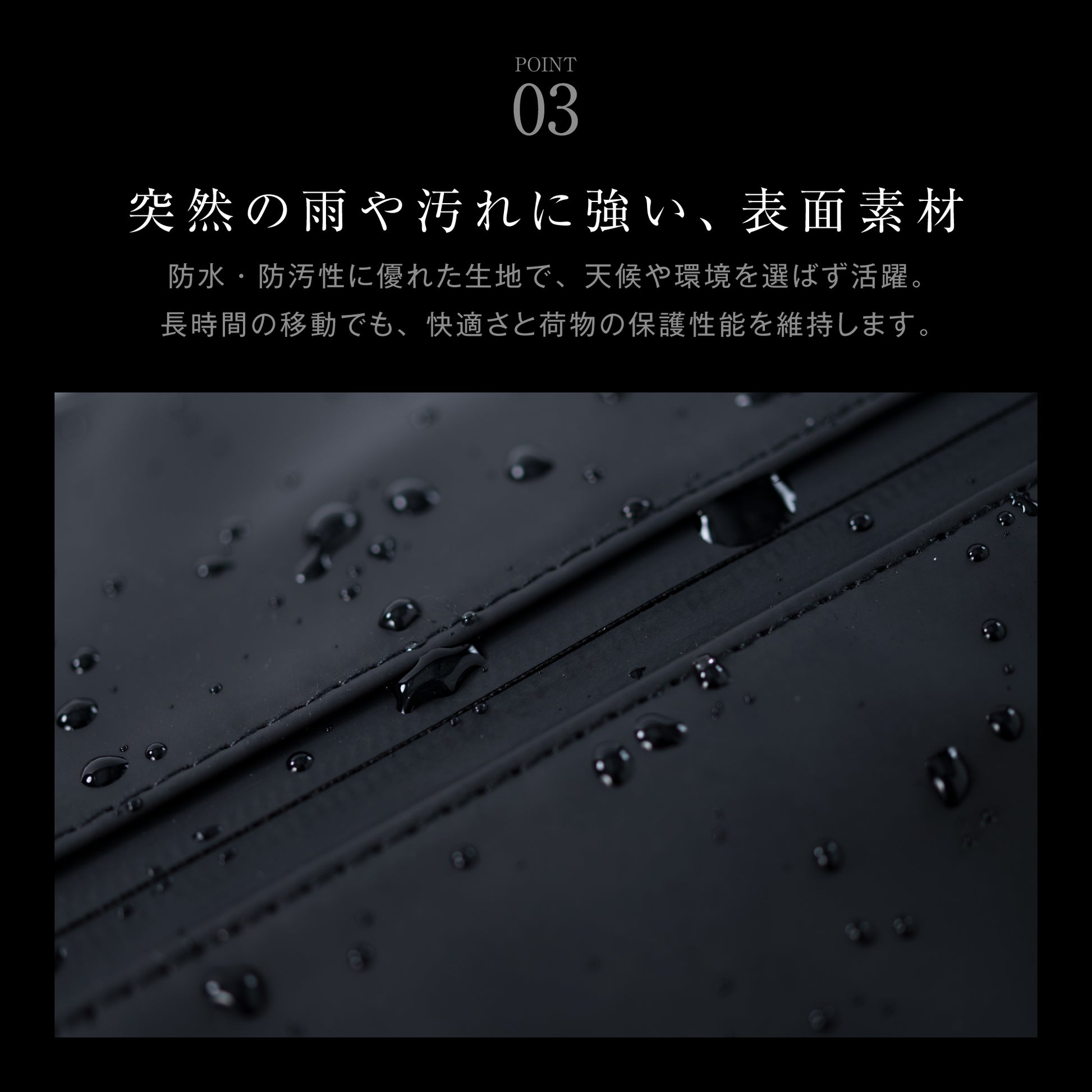 防⽔素材を使⽤し、⾬や汚れにも安⼼です。