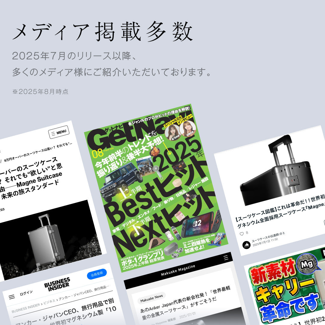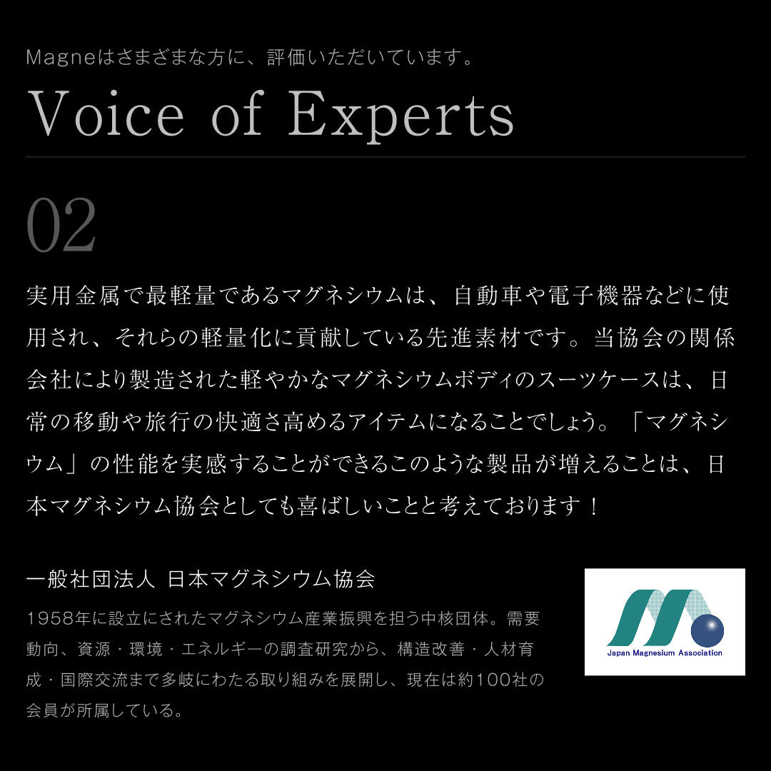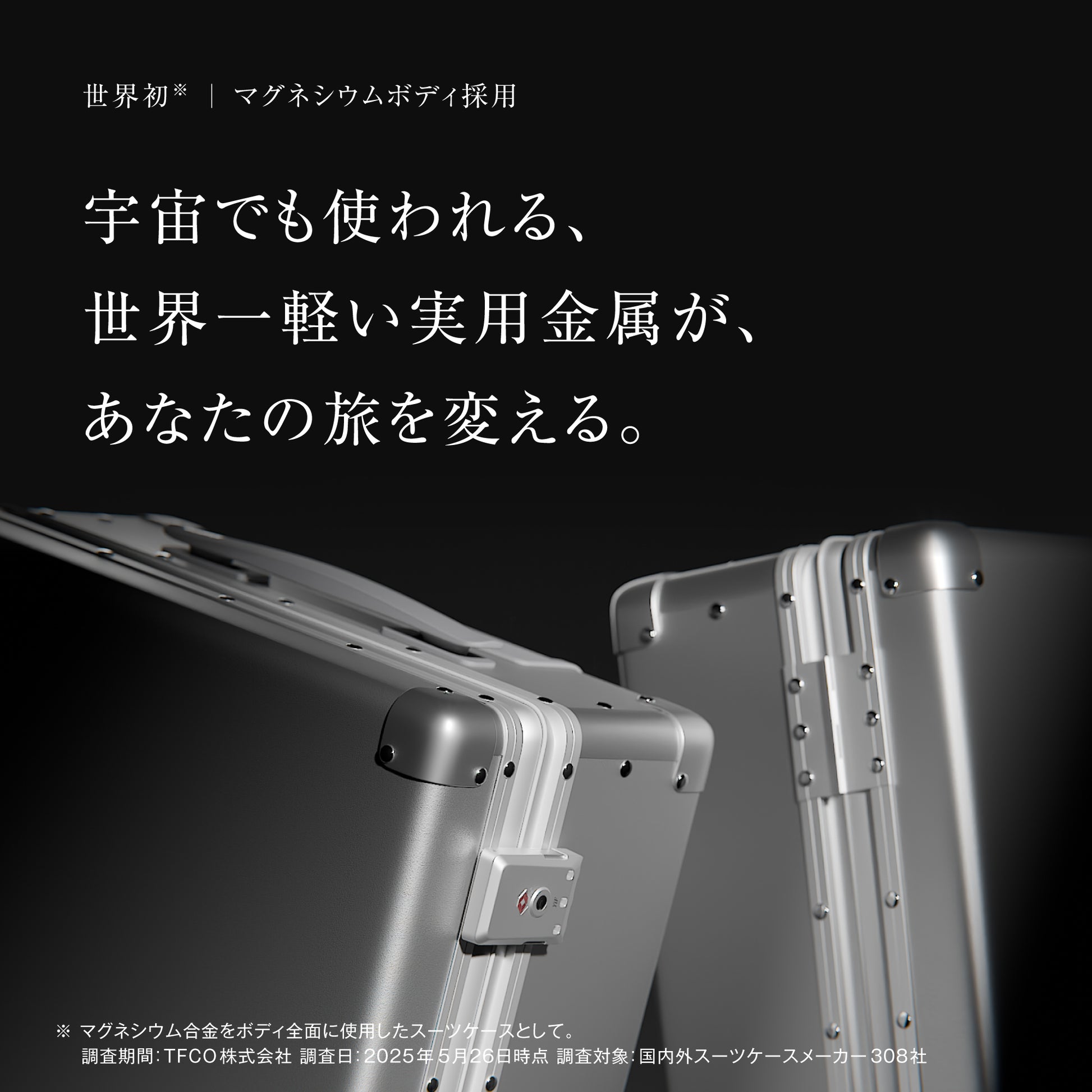 TFCO社調べ(2025年5月時点、ボディ全面にマグネシウム合金を採用したスーツケースとして)