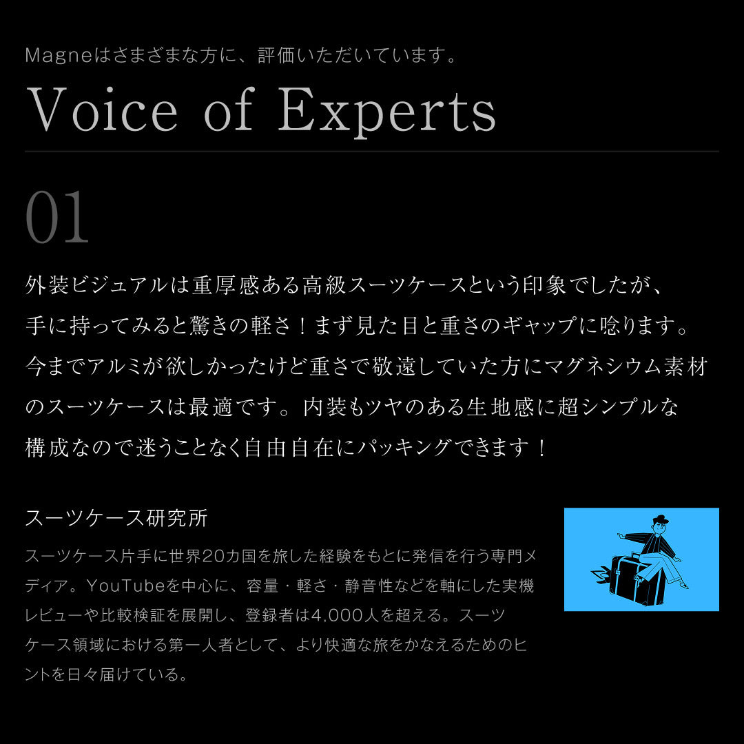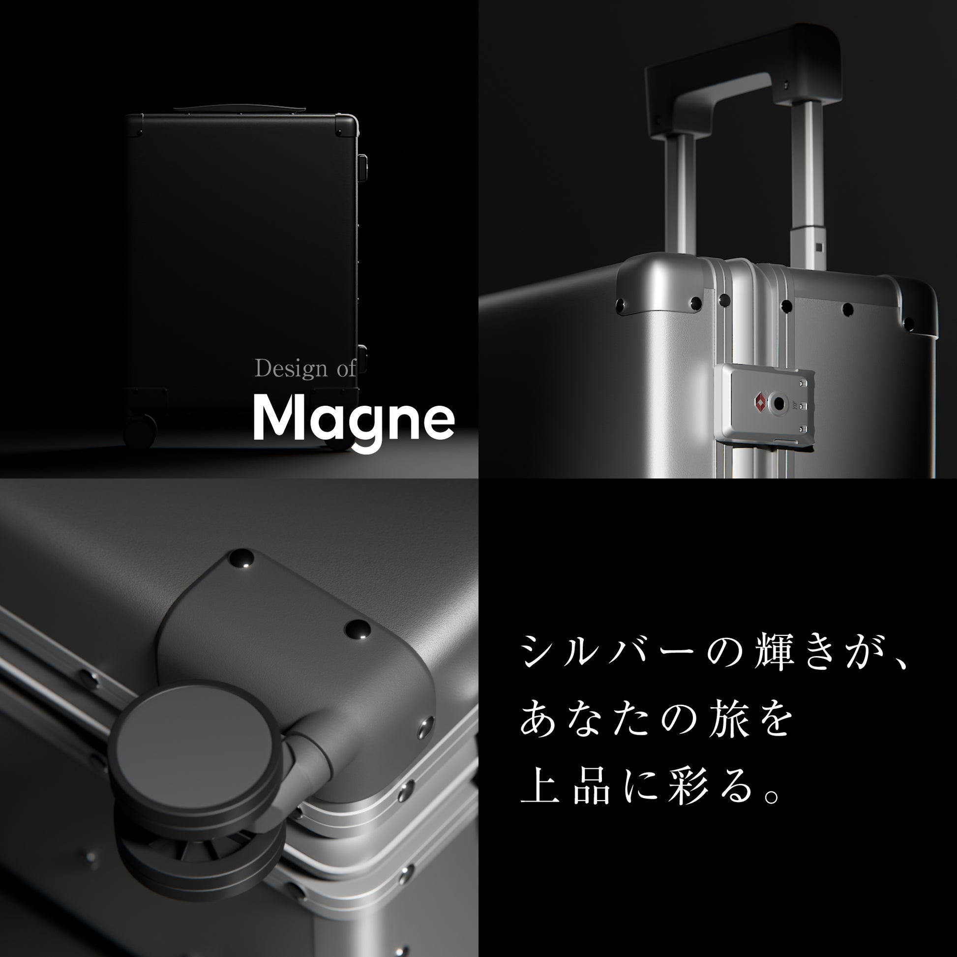 マグネシウム素材の採用に加え、すべてのパーツを一から見直し、徹底的な軽量化を図りました。 航空宇宙産業や医療分野でも採用されるマグネシウムの高精度な加工技術も詰め込み、細部の設計を工夫することで、「Magne Suitcase」は誕生しました。